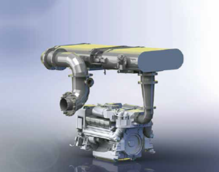 The Selective Catalytic Reduction system reduces nitrogen oxide (NOx) emissions. An aqueous ammonia solution, urea, is dosed and mixed with the exhaust gasses. Catalytic reactions convert the nitrogen oxides to harmless nitrogen (N2) and condensation (H2O).